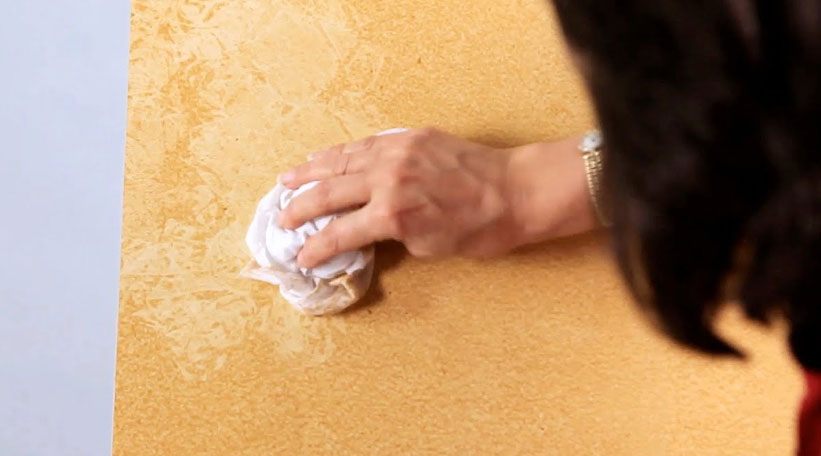 - Dip the rag or lambswool applicator into the mixed glazing compound and begin applying it to the walls. (If needed, remove lint from the lambswool applicator beforehand by “wiping” it with a section of sticky painter’s tape.)