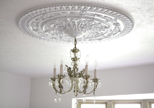 Create statement-making ceilings by installing medallions at the base of hanging lighting fixtures. Purchase plastic medallions that are scaled to the size of the fixture. Large lighting fixtures will require a larger medallion; small fixtures, smaller medallions. Paint the medallions whatever color you wish—either the same color as the ceiling or in a contrasting color that works with your color scheme—or spray paint it with a product that creates a stone effect.